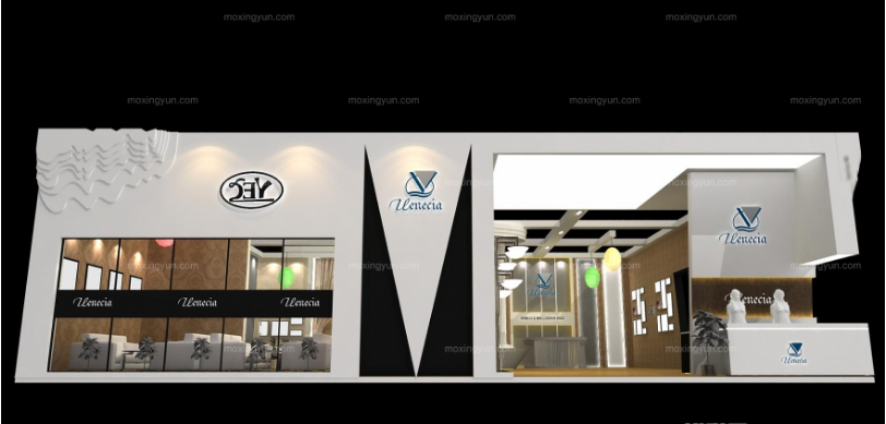 契合維涅斯的品牌形象和產(chǎn)品特性,采用曲線、框型結(jié)構(gòu),再搭配燈具燈光的效果,襯托出展位簡約、融合的氛圍,突出一種高端、舒適的時尚品味。