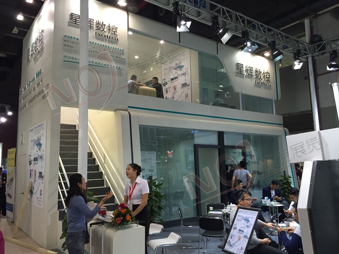 契合星輝數(shù)控的品牌形象和產(chǎn)品特性,采用框型結(jié)構(gòu),再搭配燈具燈光的效果,襯托出展位簡約、便捷的氛圍,突出一種精致、簡約的時尚品味。