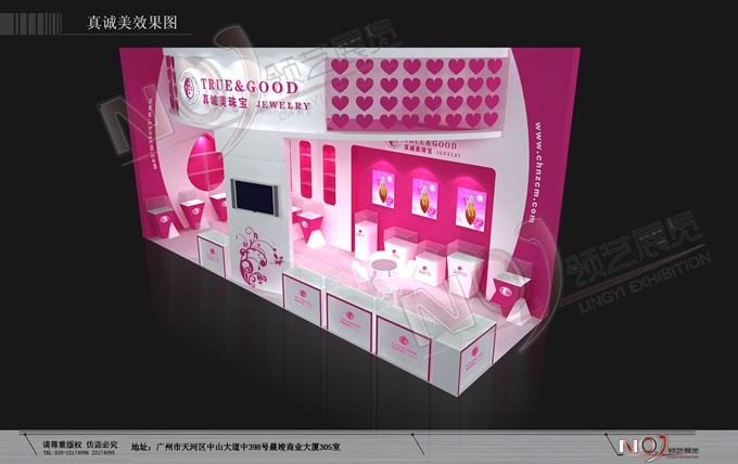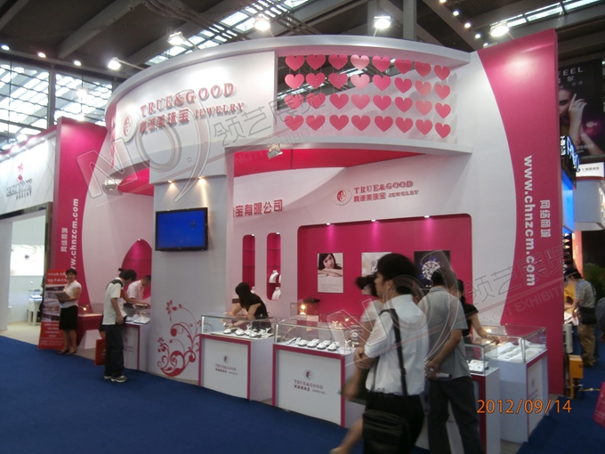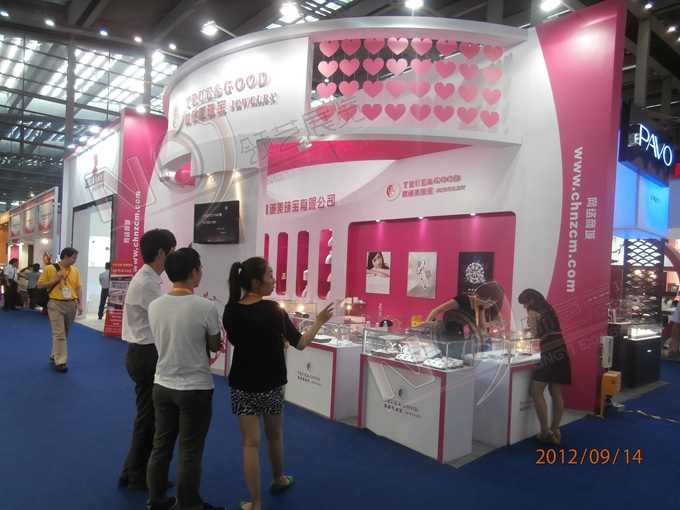 契合真誠美珠寶的品牌形象和產(chǎn)品特性,以弧形結(jié)構(gòu)為主造型,再搭配燈具燈光的效果,襯托出展位絢麗、商務的氛圍,突出一種典雅、尊貴的時尚品味