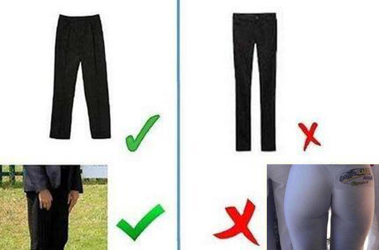 而在學校官網(wǎng)展示的合格校服圖解中,裙子是純黑色的,長度適中,剛好到膝蓋上下一點。褲子也是黑色的,為寬松的直筒褲。而對于緊身褲和打底褲,圖解上打了一個大大的紅叉,被定義為不合格校服。