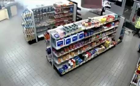 監(jiān)控錄像記錄了事發(fā)的整個(gè)過(guò)程:一開(kāi)始,兩個(gè)帶著作案工具的蒙面盜賊在用力敲擊加油站內(nèi)商店的玻璃門(mén),動(dòng)作十分兇狠。就在他們將要從被砸破的門(mén)洞中鉆進(jìn)室內(nèi)時(shí),商店的一角開(kāi)始噴發(fā)白色煙霧(仔細(xì)看下圖左上角)。