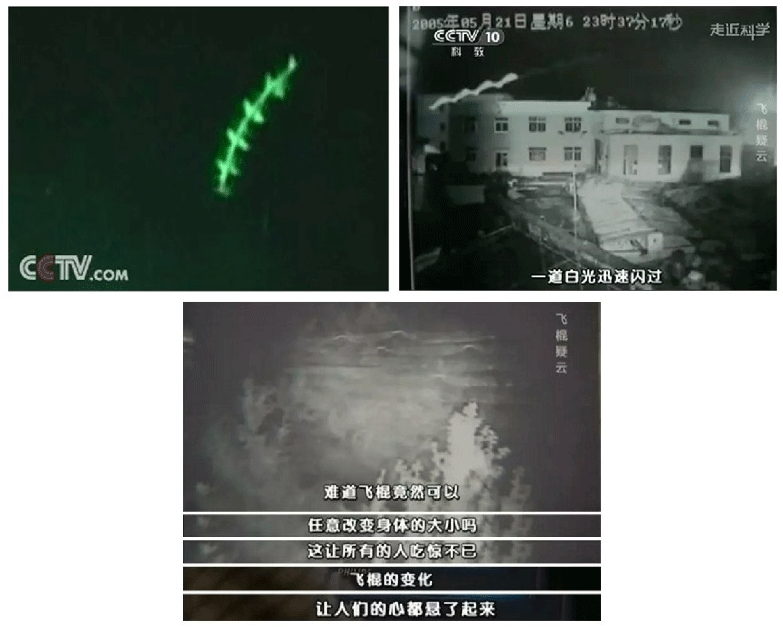 有個(gè)小區(qū)的攝像頭連續(xù)多次捕捉到一條發(fā)光的不明飛行物;這條飛行物的飛行時(shí)速相當(dāng)之快,像一道白光一閃而過(guò)。節(jié)目組還舉例了其他國(guó)家發(fā)生過(guò)的類(lèi)似的怪異事件,表示“飛棍”出現(xiàn)的時(shí)間地點(diǎn)全無(wú)規(guī)律可循,十分之玄乎。