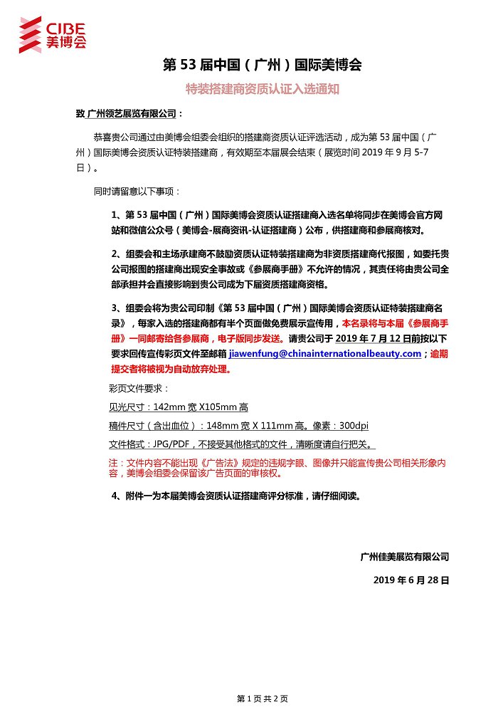 近日,廣州領(lǐng)藝展覽經(jīng)過激烈角逐,在全國會(huì)展公司中脫穎而出,喜獲53屆中國(廣州)美博會(huì)認(rèn)證特裝搭建資質(zhì)證書。領(lǐng)藝展覽是專業(yè)的展臺(tái)設(shè)計(jì)搭建公司,擁有豐富的展臺(tái)設(shè)計(jì)、搭建、運(yùn)營及維護(hù)經(jīng)驗(yàn),專注布展15年經(jīng)驗(yàn)。至今已經(jīng)服務(wù)超過千家企業(yè),致力于成為參展企業(yè)有價(jià)值的合作伙伴和有競爭力的品牌服務(wù)商;已經(jīng)成為參加美博會(huì)美博會(huì)的參展企業(yè)首選展臺(tái)設(shè)計(jì)搭建商,歡迎新老客戶前來咨詢洽談。咨詢電話:13711456636 微信同號(hào)。更多詳情請(qǐng)瀏覽我司官方網(wǎng)站:m.52tbw.com.cn