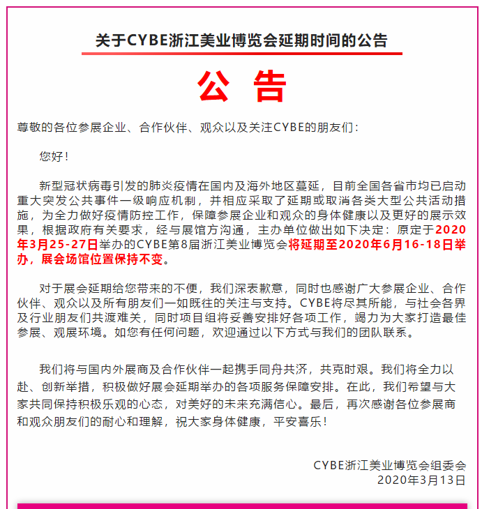 根據(jù)美博會設(shè)計搭建公司領(lǐng)藝展覽了解到,受疫情影響,原定于2020年3月25-27日舉辦的CYBE第8屆浙江美業(yè)博覽會將延期至2020年6月16-18日舉辦,展會場館位置保持不變。如需美博會設(shè)計請聯(lián)系領(lǐng)藝展覽,希望我們能在美博會搭建上為您添磚加瓦,祝各位朋友收獲多多,滿載而歸!
