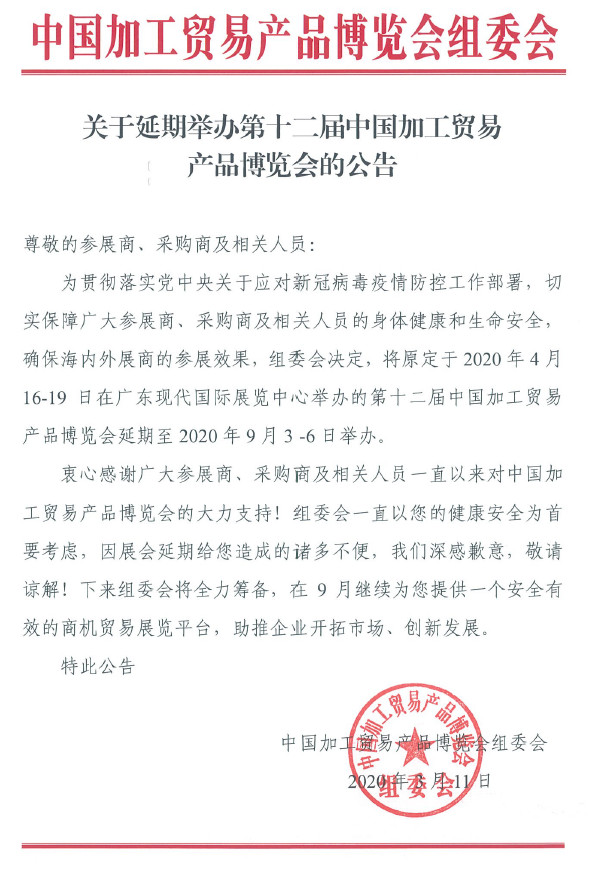 根據(jù)東莞展會設計搭建公司領藝展覽了解到,第十二屆中國加工貿易產品博覽會延期時間確定了。如需東莞展會設計請聯(lián)系領藝展覽,希望我們能在東莞展會搭建上為您添磚加瓦,祝各位朋友收獲多多,滿載而歸!