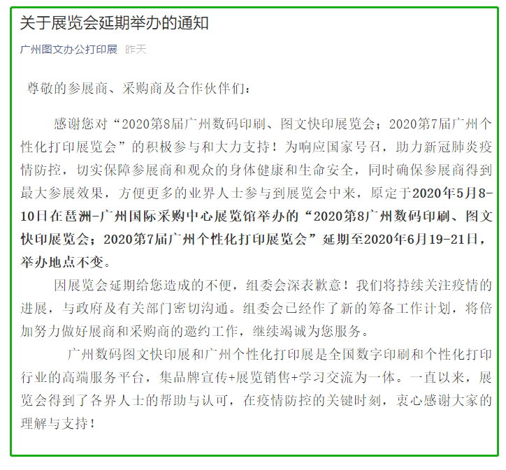 根據(jù)廣州展會設計搭建公司領藝展覽了解到,原定于2020年5月8-10日在琶洲-廣州國際采購中心展覽館舉辦的“2020第8廣州數(shù)碼印刷、圖文快印展覽會;2020第7屆廣州個性化打印展覽會”延期至2020年6月19-21日,舉辦地點不變。如需廣州展會設計請聯(lián)系領藝展覽,希望我們能在廣州展會搭建上為您添磚加瓦,祝各位朋友收獲多多,滿載而歸!