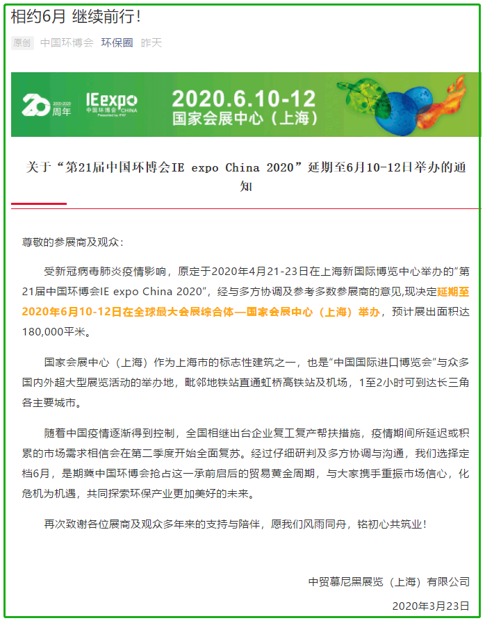 根據(jù)環(huán)博會(huì)設(shè)計(jì)搭建公司領(lǐng)藝展覽了解到,原定于2020年4月21-23日在上海新國(guó)際博覽中心舉辦的“第21屆中國(guó)環(huán)博會(huì)IE expo China 2020”,經(jīng)與多方協(xié)調(diào)及參考多數(shù)參展商的意見(jiàn),現(xiàn)決定延期至2020年6月10-12日在全球最大會(huì)展綜合體—國(guó)家會(huì)展中心(上海)舉辦,預(yù)計(jì)展出面積達(dá)180,000平米。如需環(huán)博會(huì)設(shè)計(jì)請(qǐng)聯(lián)系領(lǐng)藝展覽,希望我們能在環(huán)博會(huì)搭建上為您添磚加瓦,祝各位朋友收獲多多,滿載而歸!