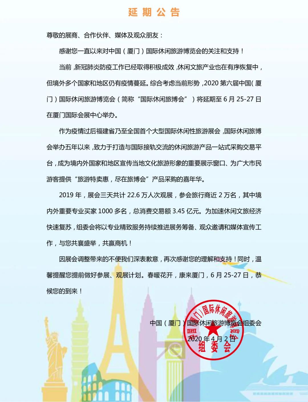 根據(jù)旅游展設(shè)計搭建公司領(lǐng)藝展覽了解到,2020第六屆中國(廈門)國際休閑旅游博覽會將延期至2020年6月25-27日舉行。如需旅游展設(shè)計請聯(lián)系領(lǐng)藝展覽,希望我們能在旅游展搭建上為您添磚加瓦,祝各位朋友收獲多多,滿載而歸!