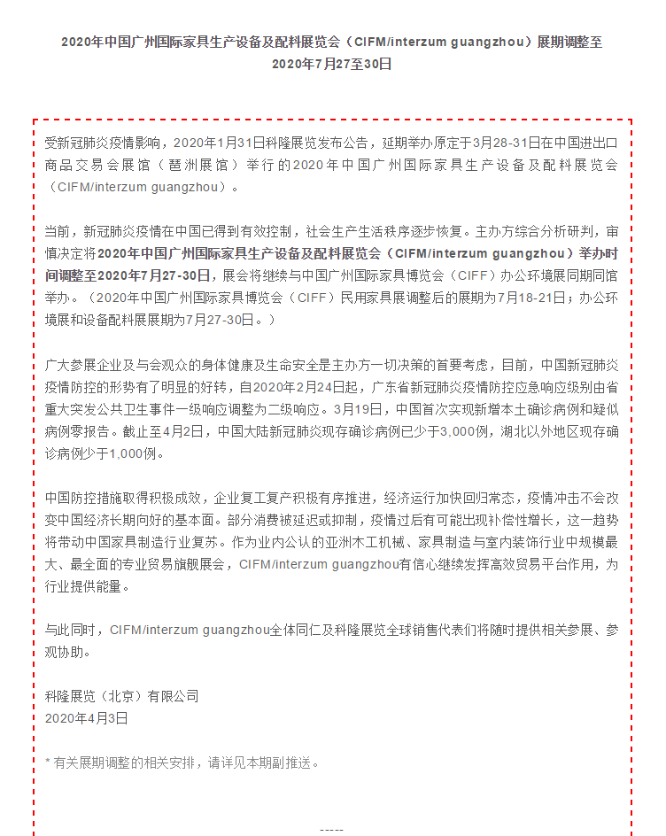 根據(jù)家具展設(shè)計(jì)搭建公司領(lǐng)藝展覽了解到,2020年中國(guó)廣州國(guó)際家具生產(chǎn)設(shè)備及配料展覽會(huì)(CIFM/interzum guangzhou)舉辦時(shí)間調(diào)整至2020年7月27-30日,展會(huì)將繼續(xù)與中國(guó)廣州國(guó)際家具博覽會(huì)(CIFF)辦公環(huán)境展同期同館舉辦。(2020年中國(guó)廣州國(guó)際家具博覽會(huì)(CIFF)民用家具展調(diào)整后的展期為7月18-21日;辦公環(huán)境展和設(shè)備配料展展期為7月27-30日。)如需家具展設(shè)計(jì)請(qǐng)聯(lián)系領(lǐng)藝展覽,希望我們能在家具展搭建上為您添磚加瓦,祝各位朋友收獲多多,滿(mǎn)載而歸!