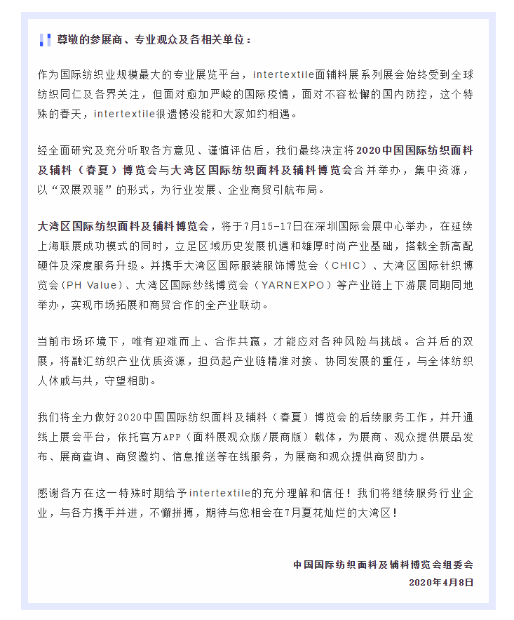 根據(jù)紡織面料展設(shè)計(jì)搭建公司領(lǐng)藝展覽了解到,2020中國(guó)國(guó)際紡織面料及輔料(春夏)博覽會(huì)與大灣區(qū)國(guó)際紡織面料及輔料博覽會(huì)合并舉辦,集中資源,以“雙展雙驅(qū)”的形式,為行業(yè)發(fā)展、企業(yè)商貿(mào)引航布局。
