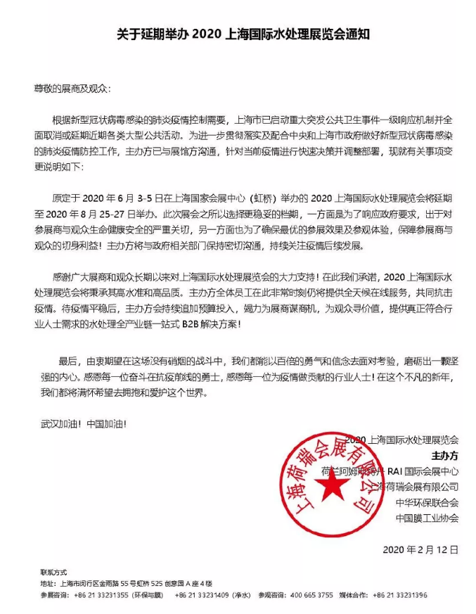 為全力支持打贏疫情防控阻擊戰(zhàn),貫徹落實(shí)上海市疫情防控工作領(lǐng)導(dǎo)小組的防疫工作指導(dǎo)方針,切實(shí)保障廣大展商和觀眾的身體健康和安全,確保展覽會(huì)的展示和觀展效果,原定于2020年6月3-5日在上海國家會(huì)展中心(虹橋)舉辦的2020上海國際水處理展覽會(huì)將延期至2020年8月25-27日舉辦。我們將繼續(xù)密切關(guān)注展會(huì)動(dòng)態(tài),希望我們能在上海水展搭建上為您添磚加瓦。!上海水展設(shè)計(jì)搭建公司領(lǐng)藝展覽在此非常時(shí)刻仍將提供全天候在線服務(wù),共同抗擊疫情。預(yù)祝各位朋友收獲多多,滿載而歸!