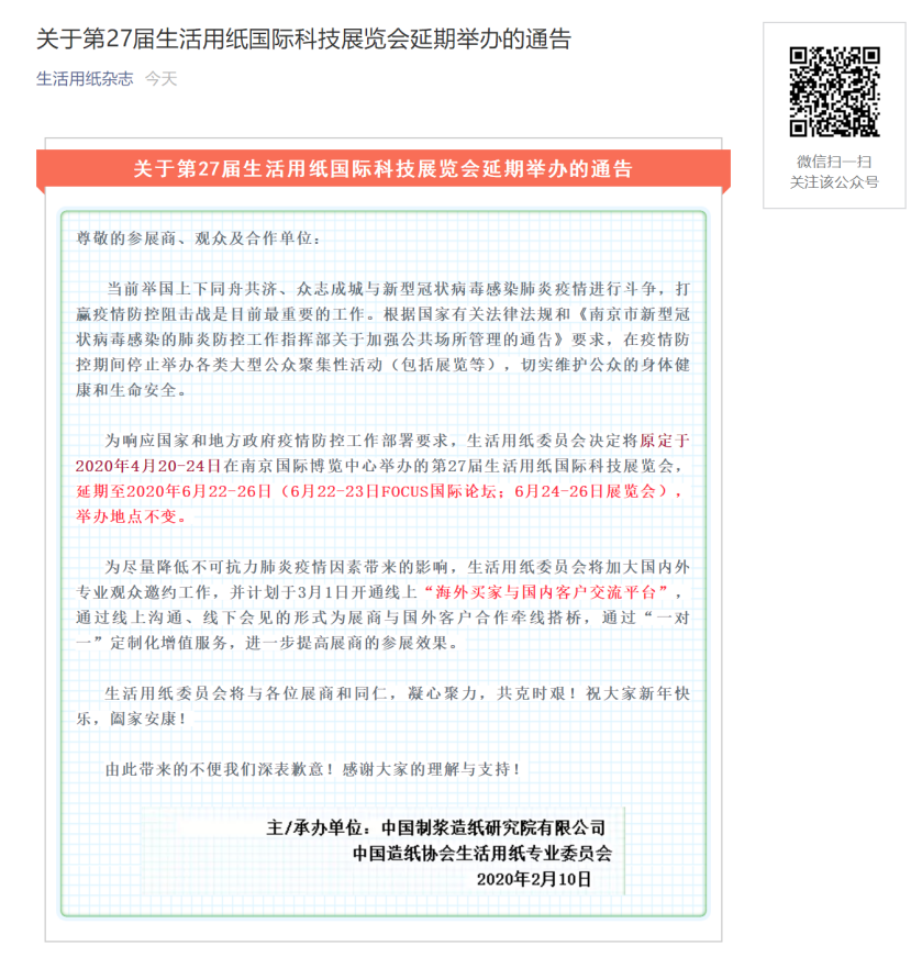 根據(jù)南京紙展設(shè)計(jì)搭建公司領(lǐng)藝展覽解到,為響應(yīng)國家和地方政府疫情防控工作部署要求,生活用紙委員會(huì)決定將原定于2020年4月20-24日在南京國際博覽中心舉辦的第27屆生活用紙國際科技展覽會(huì),延期至2020年6月22-26日(6月22-23日FOCUS國際論壇;6月24-26日展覽會(huì)),舉辦地點(diǎn)不變。如需南京紙展設(shè)計(jì)請(qǐng)聯(lián)系領(lǐng)藝展覽,希望我們能在南京紙展搭建上為您添磚加瓦,祝各位朋友收獲多多,滿載而歸!