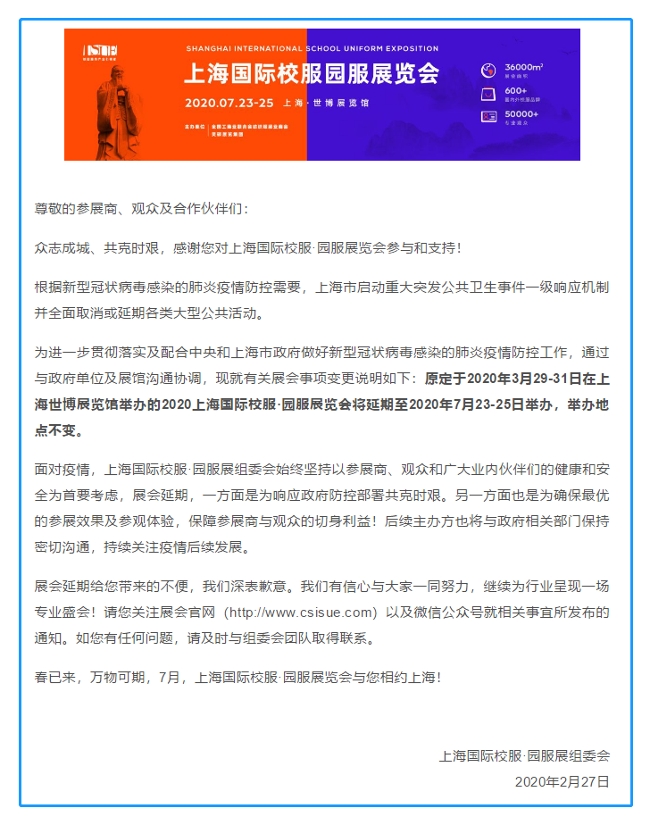 根據(jù)上海校服展設(shè)計(jì)搭建公司領(lǐng)藝展覽了解到,根據(jù)新型冠狀病毒感染的肺炎疫情防控需要,上海市啟動(dòng)重大突發(fā)公共衛(wèi)生事件一級響應(yīng)機(jī)制并全面取消或延期各類大型公共活動(dòng)。為進(jìn)一步貫徹落實(shí)及配合中央和上海市政府做好新型冠狀病毒感染的肺炎疫情防控工作,通過與政府單位及展館溝通協(xié)調(diào),現(xiàn)就有關(guān)展會(huì)事項(xiàng)變更說明如下:原定于2020年3月29-31日在上海世博展覽館舉辦的2020上海國際校服·園服展覽會(huì)將延期至2020年7月23-25日舉辦,舉辦地點(diǎn)不變。面對疫情,上海國際校服·園服展組委會(huì)始終堅(jiān)持以參展商、觀眾和廣大業(yè)內(nèi)伙伴們的健康和安全為首要考慮,展會(huì)延期,一方面是為響應(yīng)政府防控部署共克時(shí)艱。另一方面也是為確保最優(yōu)的參展效果及參觀體驗(yàn),保障參展商與觀眾的切身利益!后續(xù)主辦方也將與政府相關(guān)部門保持密切溝通,持續(xù)關(guān)注疫情后續(xù)發(fā)展。如需上海校服展設(shè)計(jì)請聯(lián)系領(lǐng)藝展覽,希望我們能在上海校服展搭建上為您添磚加瓦,祝各位朋友收獲多多,滿載而歸!