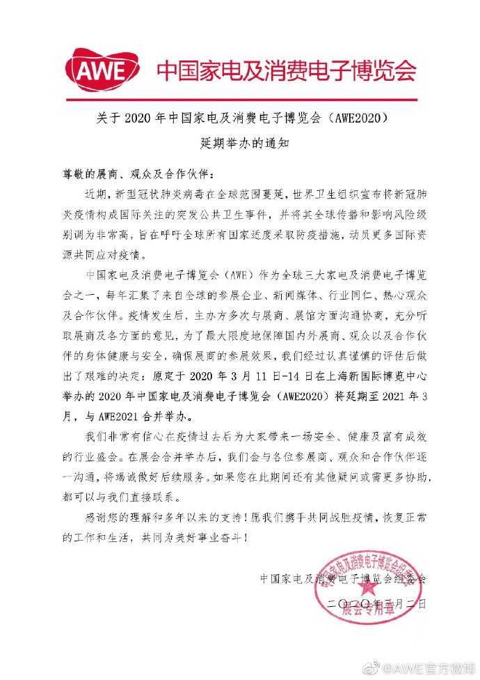 根據(jù)上海電子展設(shè)計搭建公司領(lǐng)藝展覽了解到,AWE官方發(fā)布公告稱,原定于2020年3月11日-14日在在上海2020年中國家電及消費電子博覽會(AWE2020)將延期至2021年3月,與AWE2021合并舉辦。這也意味著#AWE2020正式取消#。如需上海展臺設(shè)計請聯(lián)系領(lǐng)藝展覽,希望我們能在上海展臺搭建上為您添磚加瓦,祝各位朋友收獲多多,滿載而歸!