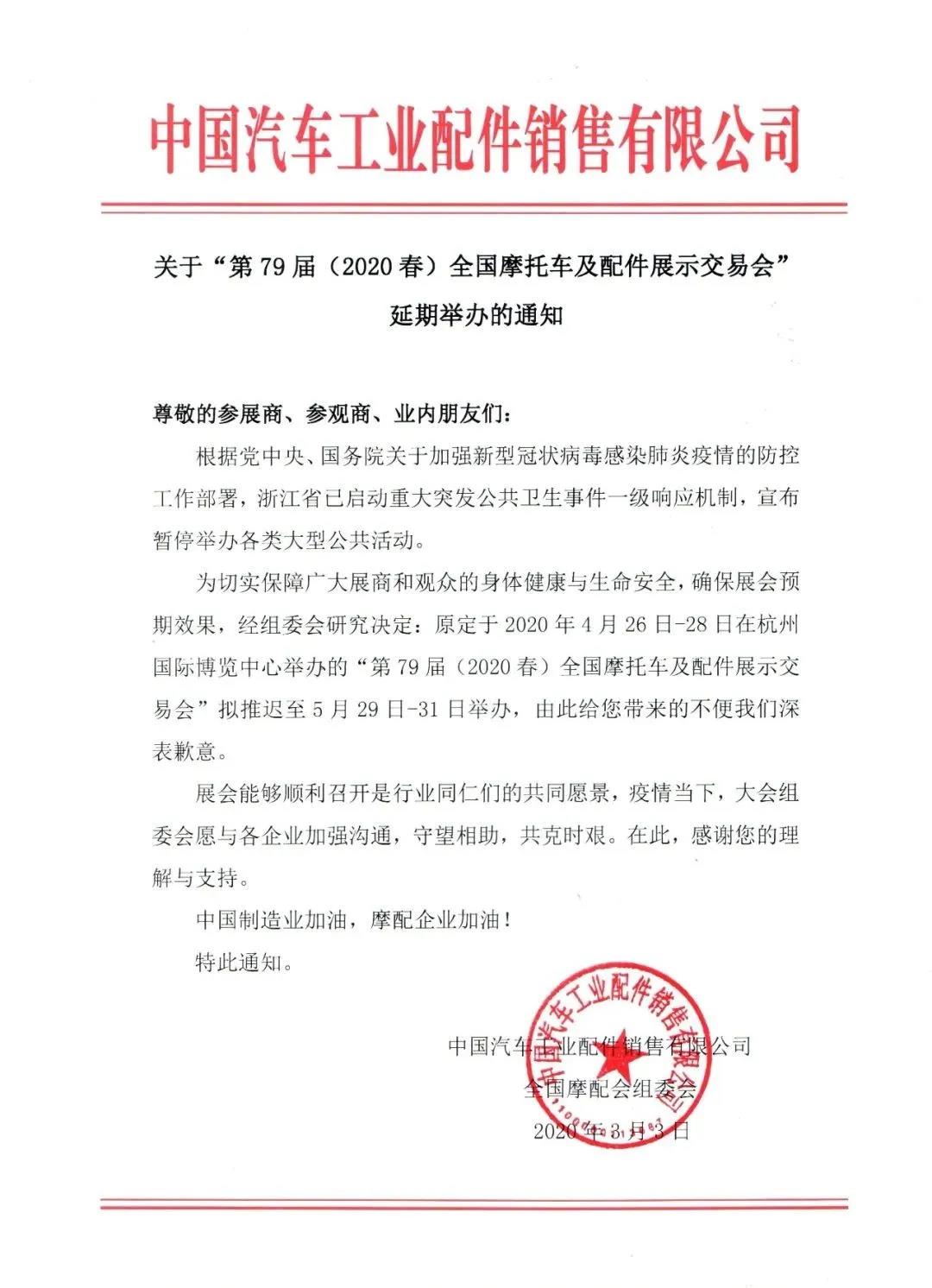 根據(jù)摩配會展設(shè)計搭建公司領(lǐng)藝展覽了解到,因受新冠肺炎疫情影響,第79屆全國摩配會擬推遲至2020年5月29日-31日舉辦,如需全國摩配會展臺設(shè)計請聯(lián)系領(lǐng)藝展覽,希望我們能在全國摩配會展臺搭建上為您添磚加瓦,祝各位朋友收獲多多,滿載而歸!