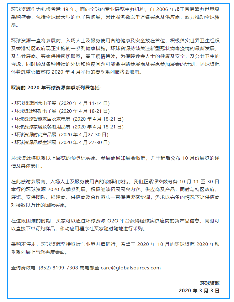 根據(jù)品質(zhì)生活展設(shè)計(jì)搭建公司領(lǐng)藝展覽了解到,環(huán)球資源作為扎根香港 49 年、面向全球的專業(yè)展覽主辦機(jī)構(gòu),自 2006 年起于香港籌辦世界級采購盛會,包括全球最大型的電子采購展,累計(jì)服務(wù)數(shù)以千萬名買家及供應(yīng)商,致力推動全球貿(mào)易?;谝咔槌掷m(xù),為保障參會人士的健康及安全,及公共衛(wèi)生的考慮,同時顧及各種持續(xù)的外訪和檢疫問題可能會中斷參展商及買家參加展會的計(jì)劃,環(huán)球資源懷著沉重心情宣布 2020 年 4 月舉行的春季系列展將會取消。原計(jì)劃環(huán)球資源品質(zhì)生活展展會時間是2020 年 4 月 27-30 日。環(huán)球資源將聯(lián)系展覽的預(yù)登記買家、參展商通知展會取消,并于稍后公布 10 月份展覽的詳情及具體安排。如需品質(zhì)生活展展臺設(shè)計(jì)請聯(lián)系領(lǐng)藝展覽,希望我們能在品質(zhì)生活展展臺搭建上為您添磚加瓦,祝各位朋友收獲多多,滿載而歸!