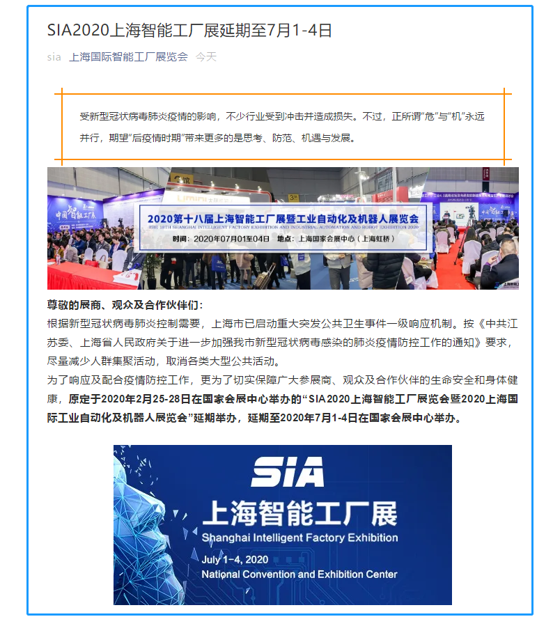 根據(jù)上海智能工廠展設計搭建公司領藝展覽了解到,原定于2020年2月25-28日在國家會展中心舉辦的“SIA2020上海智能工廠展覽會暨2020上海國際工業(yè)自動化及機器人展覽會”延期舉辦,延期至2020年7月1-4日在國家會展中心舉辦。如需上海智能工廠展展臺設計請聯(lián)系領藝展覽,希望我們能在上海智能工廠展展臺搭建上為您添磚加瓦,祝各位朋友收獲多多,滿載而歸!