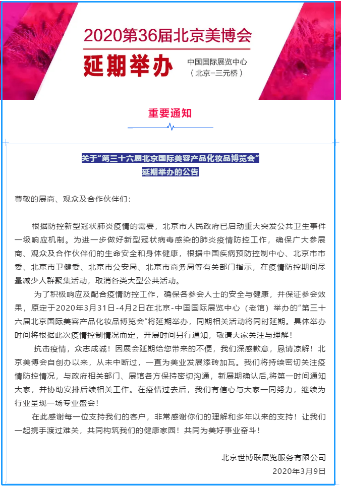 根據(jù)美博會(huì)展臺(tái)設(shè)計(jì)搭建公司領(lǐng)藝展覽了解到,為了積極響應(yīng)及配合疫情防控工作,確保各參會(huì)人士的安全與健康,并保證參會(huì)效果,原定于2020年3月31日-4月2日在北京-中國(guó)國(guó)際展覽中心(老館)舉辦的“第三十六屆北京國(guó)際美容產(chǎn)品化妝品博覽會(huì)”將延期舉辦,同期相關(guān)活動(dòng)將同時(shí)延期。如需美博會(huì)展臺(tái)設(shè)計(jì)請(qǐng)聯(lián)系領(lǐng)藝展覽,希望我們能在美博會(huì)展臺(tái)搭建上為您添磚加瓦,祝各位朋友收獲多多,滿載而歸!
