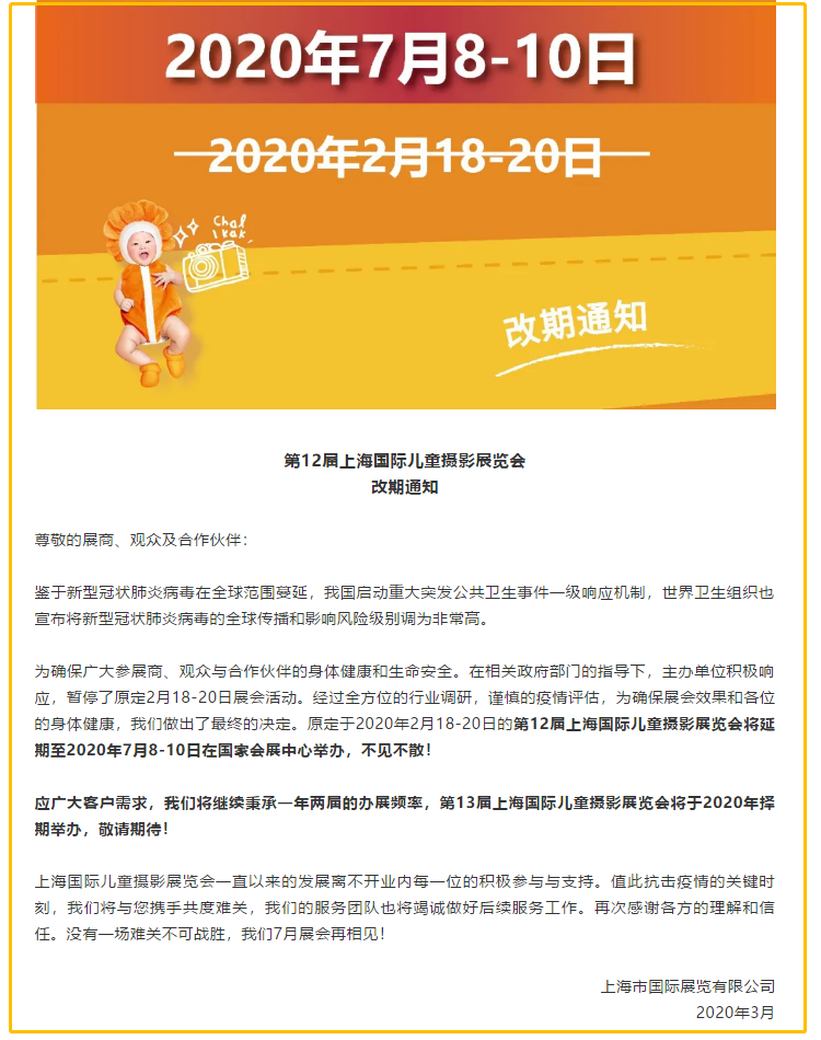 根據(jù)上海展臺設(shè)計搭建公司領(lǐng)藝展覽了解到,原定于2020年2月18-20日的第12屆上海國際兒童攝影展覽會將延期至2020年7月8-10日在國家會展中心舉辦。如需上海展臺設(shè)計請聯(lián)系領(lǐng)藝展覽,希望我們能在上海展臺搭建上為您添磚加瓦,祝各位朋友收獲多多,滿載而歸!
