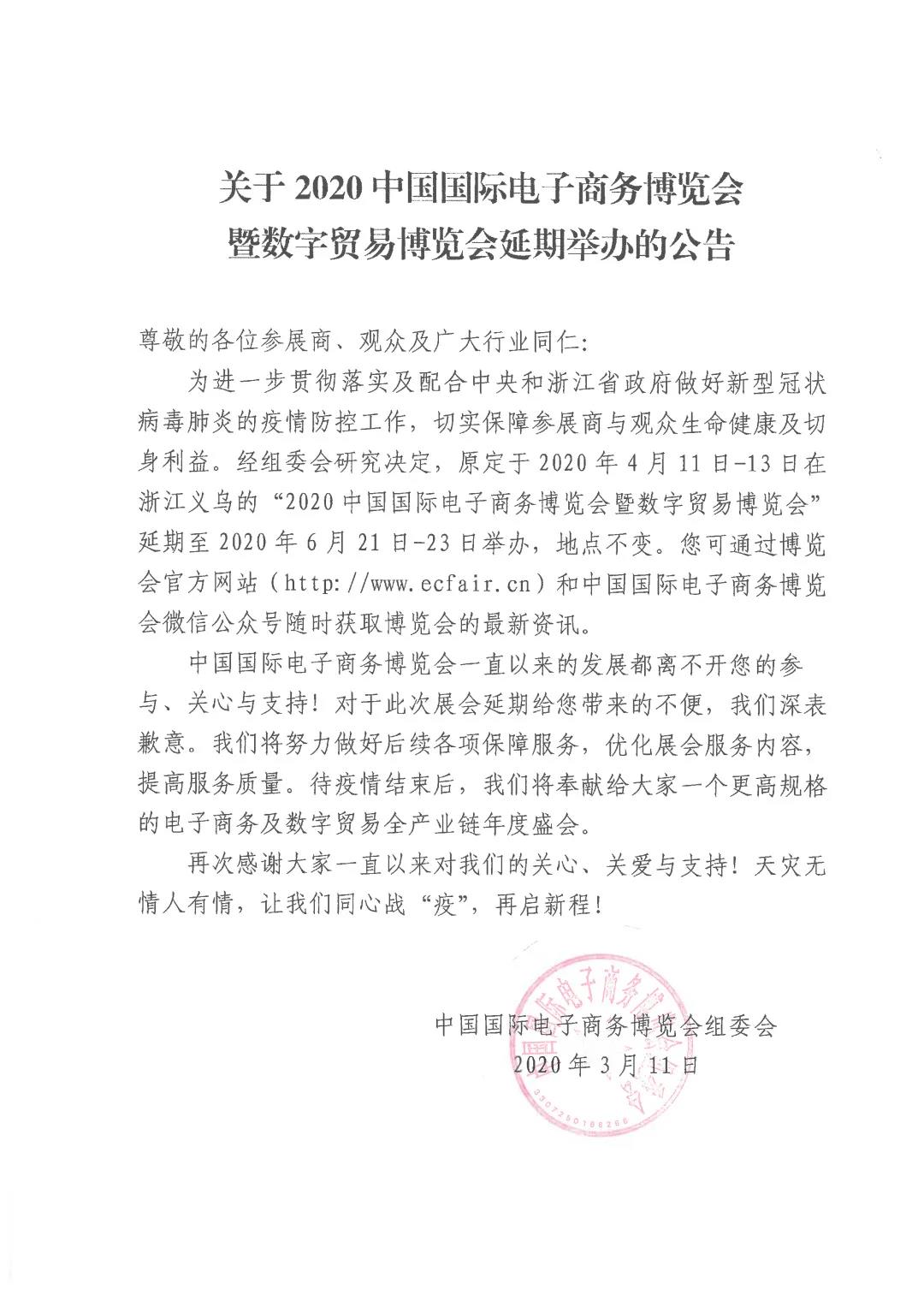 根據(jù)義烏展臺設(shè)計(jì)搭建公司領(lǐng)藝展覽了解到,原定于“2020年4月11-13日”在義烏國際博覽中心舉辦的“2020中國國際電子商務(wù)博覽會及數(shù)字貿(mào)易博覽會”延期至2020年6月21-23日舉辦,地點(diǎn)不變。如需電商博覽會設(shè)計(jì)請聯(lián)系領(lǐng)藝展覽,希望我們能在電商博覽會搭建上為您添磚加瓦,祝各位朋友收獲多多,滿載而歸!