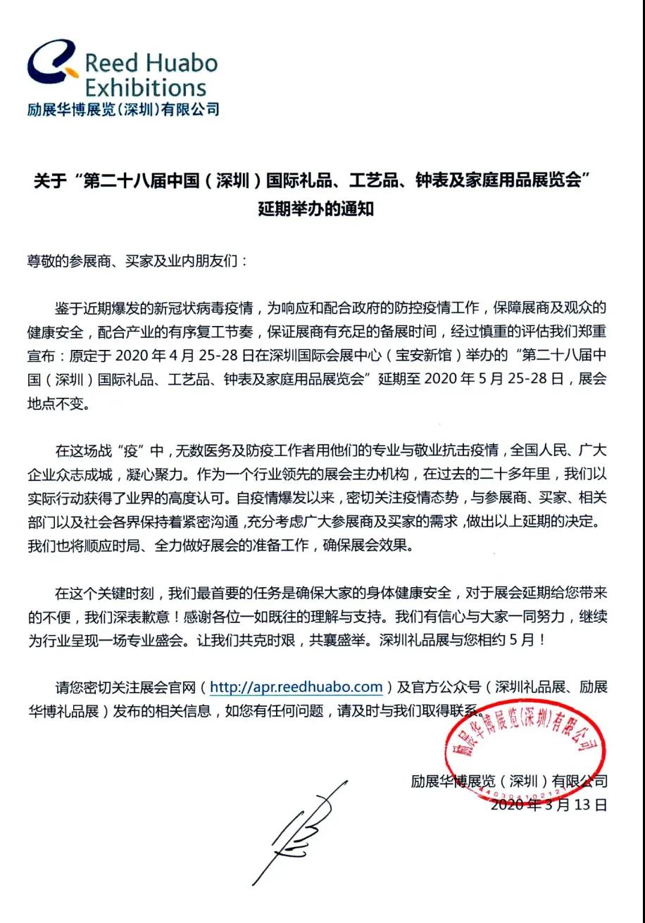 根據(jù)禮品展設(shè)計(jì)搭建公司領(lǐng)藝展覽了解到,原定于2020年4月25-28日在深圳國際會展中心(寶安新館)舉辦的“第二十八屆中國(深圳)國際禮品、工藝品、鐘表及家庭用品展覽會”延期至2020年5月25-28日,展會地點(diǎn)不變。如需禮品展設(shè)計(jì)請聯(lián)系領(lǐng)藝展覽,希望我們能在禮品展搭建上為您添磚加瓦,祝各位朋友收獲多多,滿載而歸!