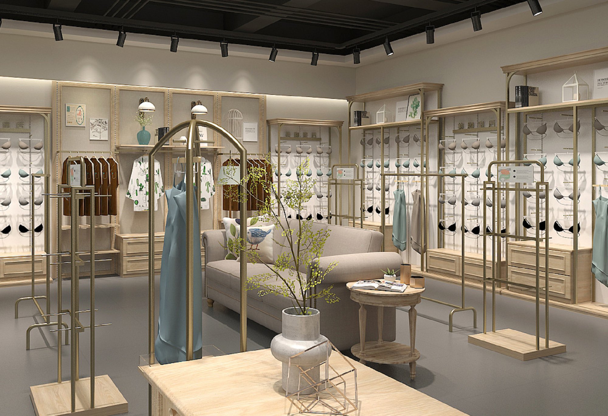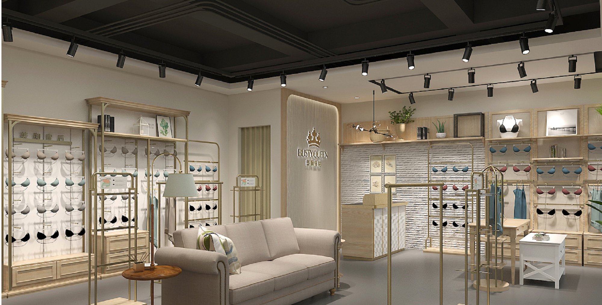 契合美胸皇后的品牌形象和產(chǎn)品特性,采用開放式結(jié)構(gòu)進行合理的分區(qū),再搭配燈具燈光的效果,襯托出專賣店大氣、豪華的氛圍,突出一種簡約、時尚的品味。