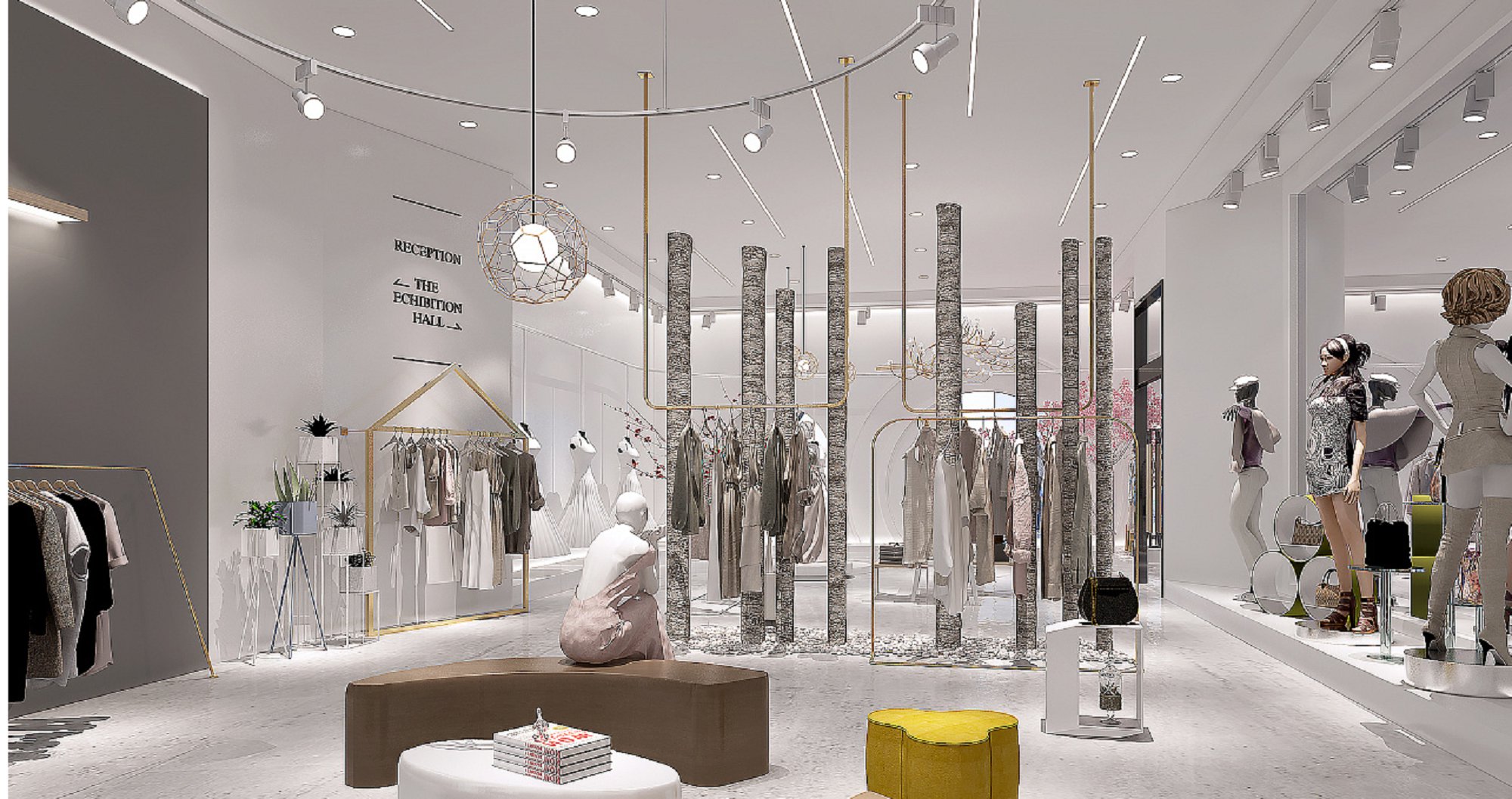 契合EIsissil服裝的品牌形象和產(chǎn)品特性,采用開放式結(jié)構(gòu)進(jìn)行合理的分區(qū),再搭配燈具燈光的效果,襯托出展廳大氣、豪華的氛圍,突出一種簡約、時(shí)尚的品味。